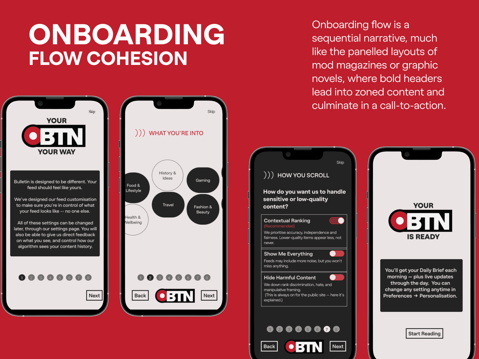 Mod as a subculture has a precise, legible grammar, and that turned out to be genuinely useful as a design constraint, not just a reference. The question the interface puts to the reader changes from what's next if you keep going to what do you actually want to read. The palette — red, black, white — is functional. In a landscape of beige wellness UIs it signals that you're in a space for sharp reading, not soothing distraction.