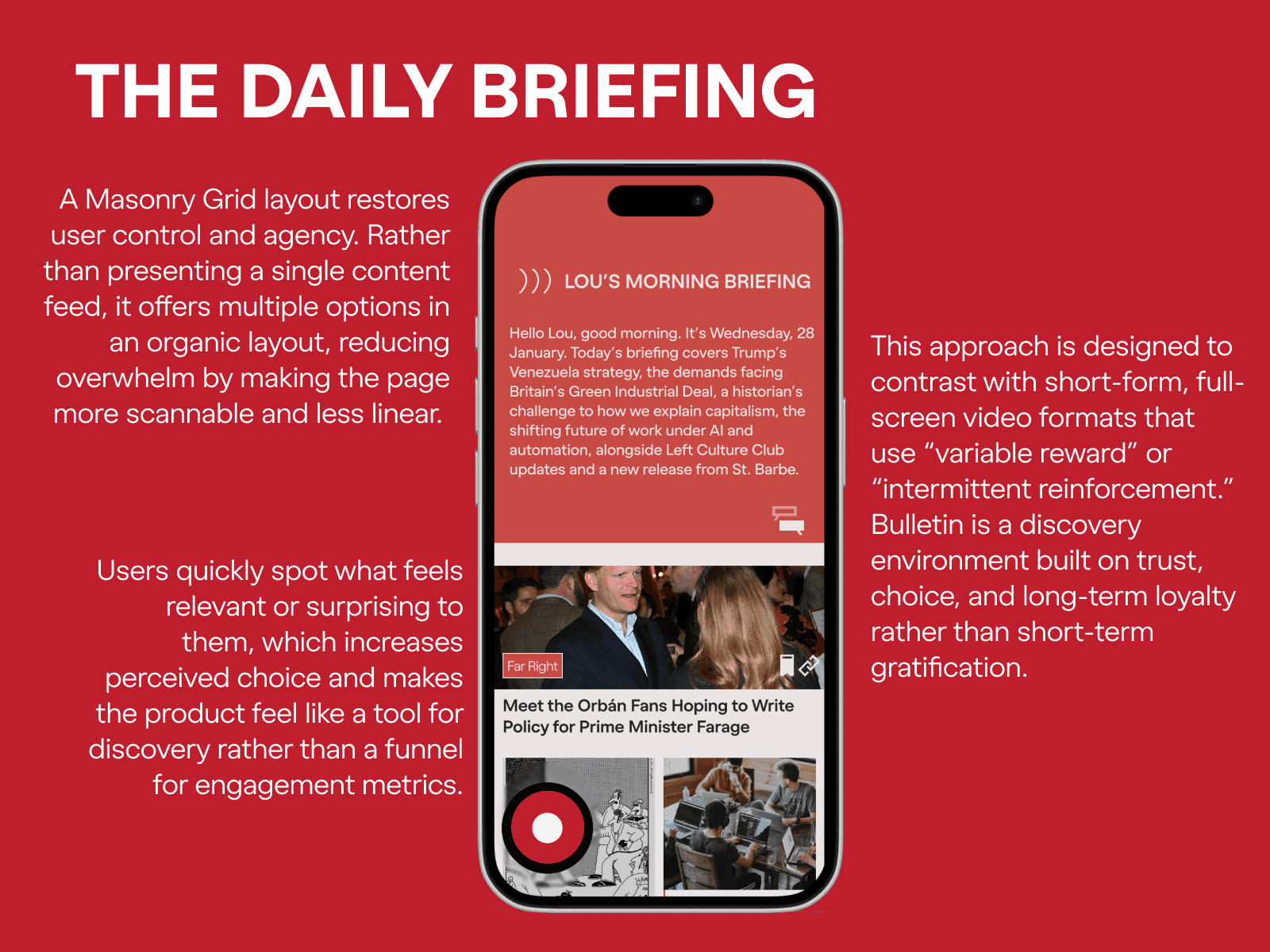 UK independent media has a distribution problem that isn't really about reach. The aggregators that exist either flatten everything into one algorithmic feed or just replicate the platform logic publishers are trying to get away from. The dominant UI grammar — infinite scroll, intermittent reward, optimised session length — is structurally hostile to the kind of slow, loyal readership independent media needs to survive. You can't fix that with better content recommendations. The interface itself has to ask something different of the reader.
