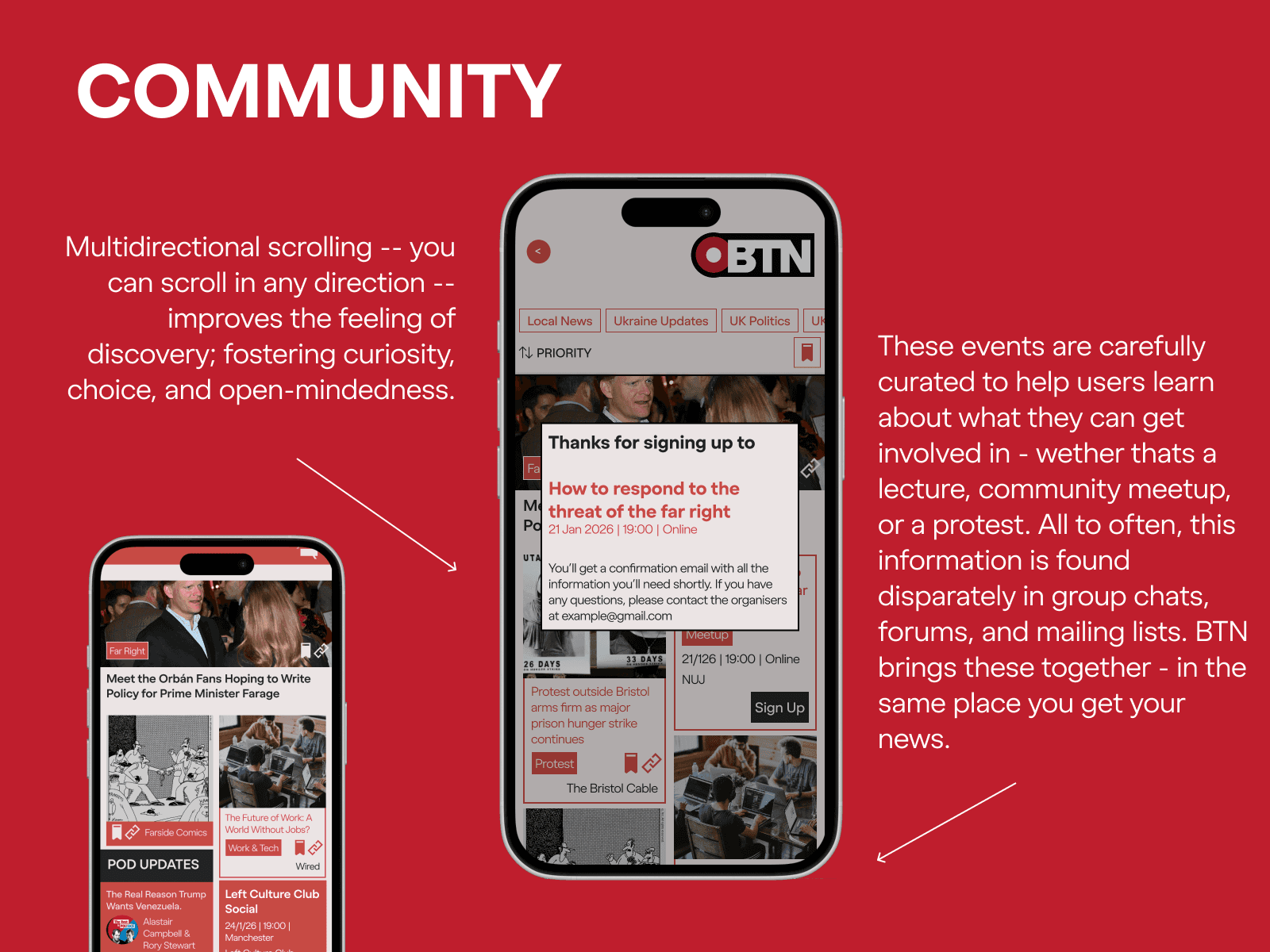 A news aggregator for independent UK media, designed to refuse the scroll-and-reward logic of mainstream platforms without feeling worthy about it. Mod tailoring as a control system, not a moodboard. Zoned layouts, masonry grid, a palette that means business.