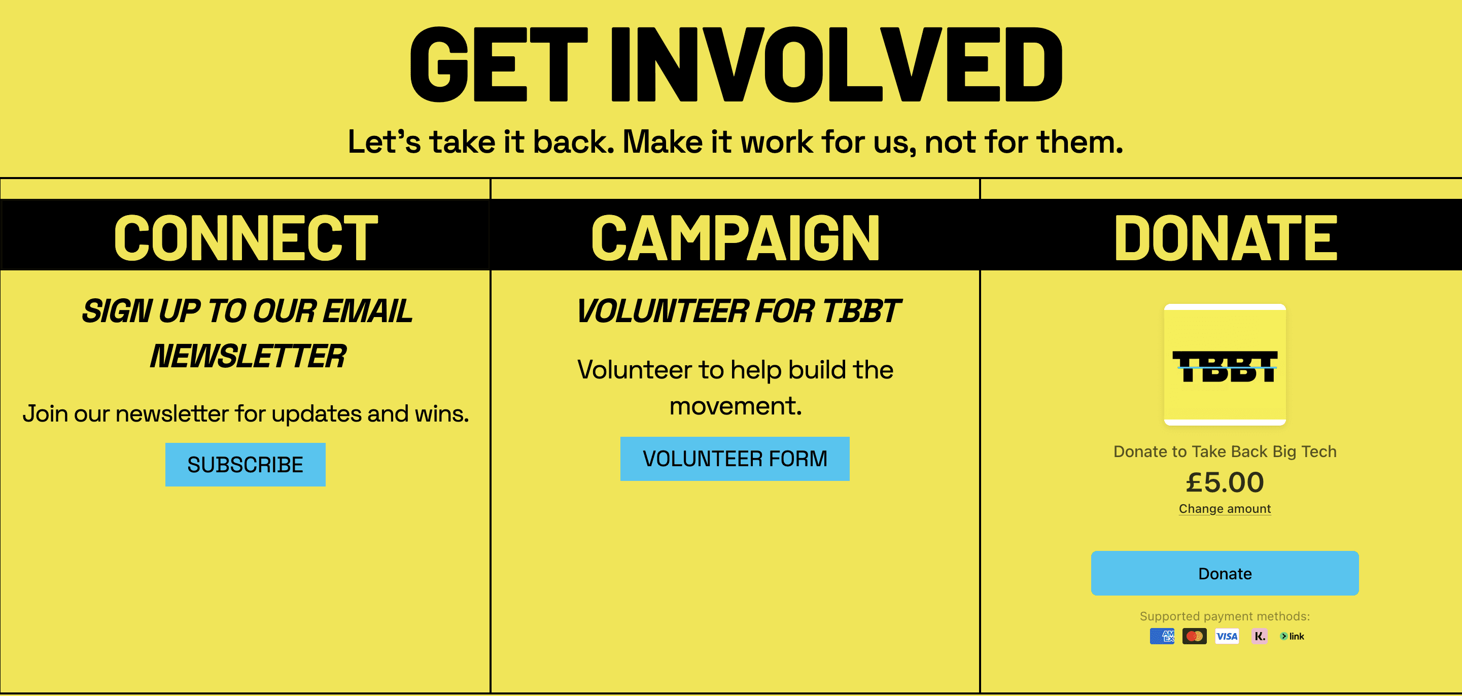 The website structure follows the campaign's logic. It opens with the problem — Big Tech is ruining our world — then moves through the detail: social media isn't social, AI is a war machine, the internet is no longer ours. From there, it sets out the structural opportunity (existing legislation that needs public backing) and ends with clear actions — subscribe, volunteer, donate. Every section of the site leads to something you can do.