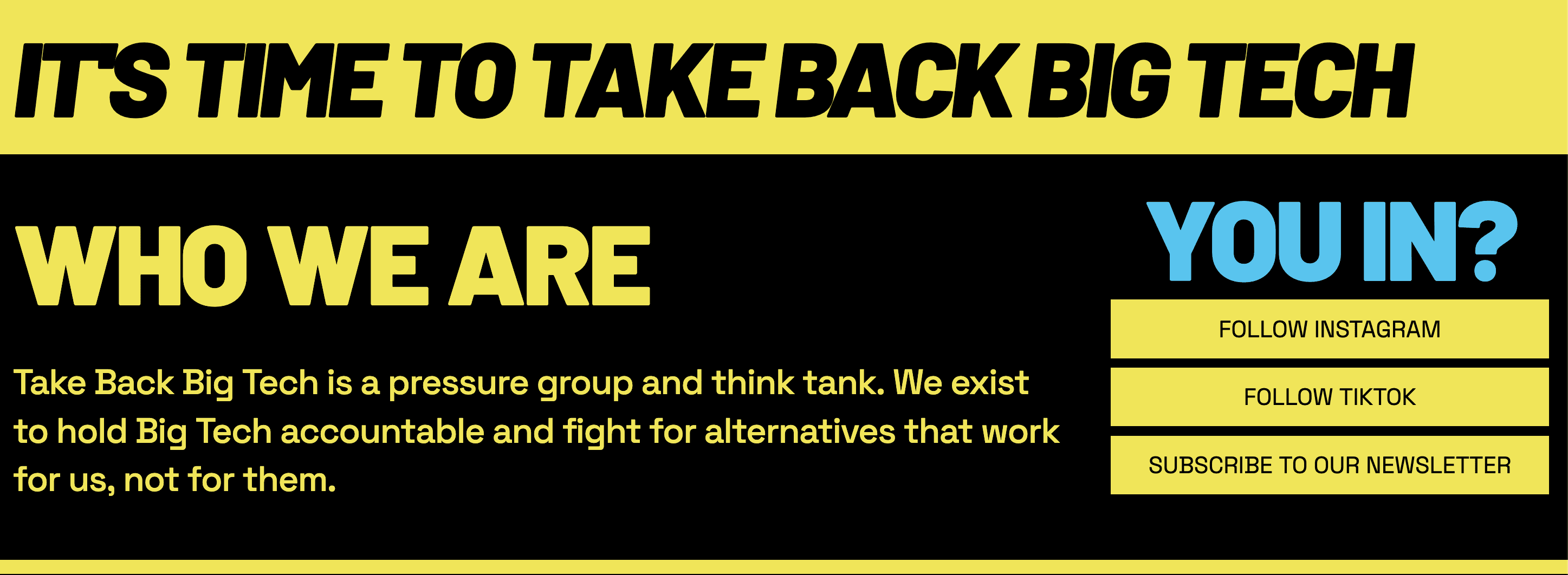The identity and website have given Take Back Big Tech a foundation to build from — a visual system and web presence that can grow with the campaign across digital, print, and physical contexts.